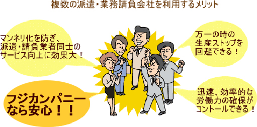 一社だけのお取引の場合、その派遣会社の供給能力によって生産効率を左右されてしまいます。複数の派遣・業務請負会社とお取引いただくことで、迅速かつ効率的に労働力を確保できます。